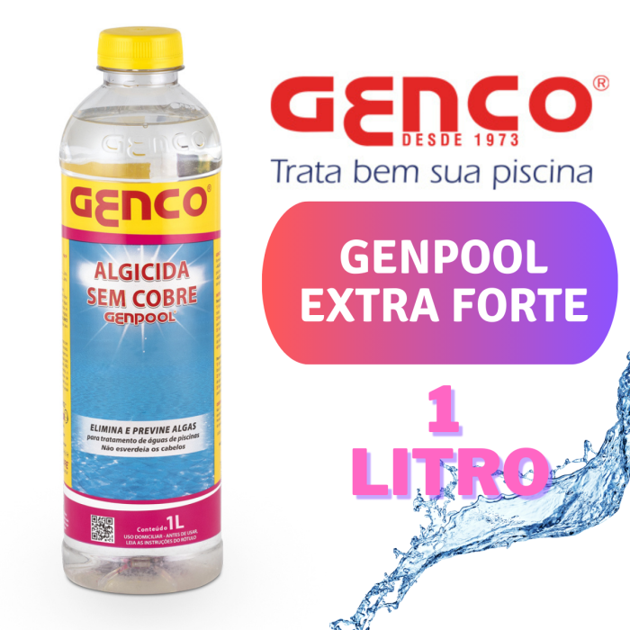GENPOOL é isento de metais pesados, que reúne numa só formulação as funções de algicida (mata algas) e algistático (impede seu desenvolvimento em águas limpas), além de ser também um potente desinfetante para trajes de banho, acessórios aquáticos, pisos e paredes de saunas e vestiários, etc.