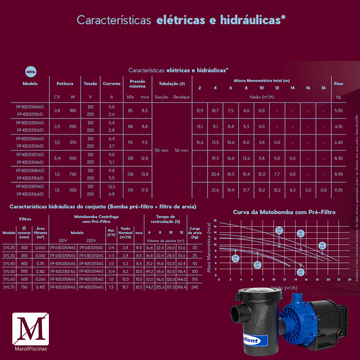 A Bomba Para Piscina Syllent PF42M100-220/AS, é indicada para circulação de água nos sistemas de filtragem e aquecimento. Pode ser utilizada em piscinas e spas.