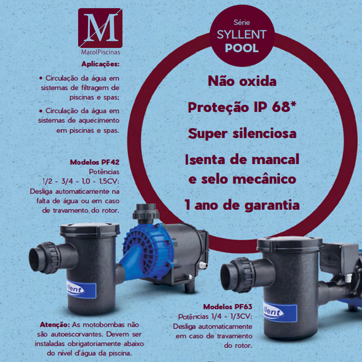 Bomba para Piscinas 1/2 CV 220V IP68 Autoescorvante BLINDADA Syllent