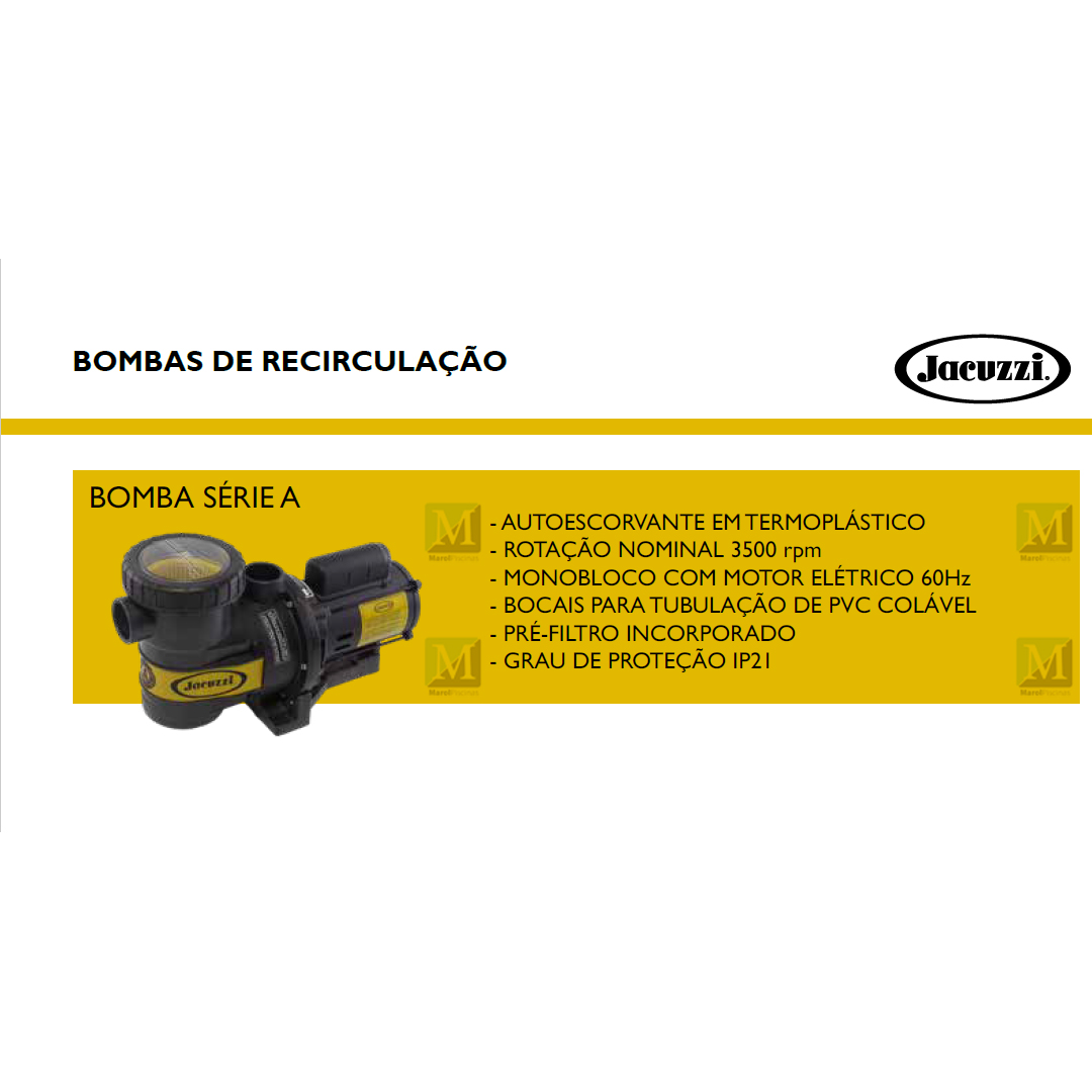 As bombas Jacuzzi da série A são centrífugas, auto-escorvantes, com pré-filtro incorporado, totalmente arquitetadas em material termoplástico, com bocais de sucção e descarga adaptados para tubulação de PVC marrom colável de 50 mm de diâmetro.