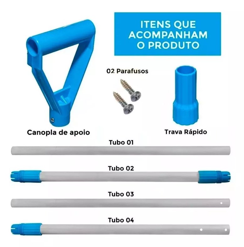 Fabricados com tubos corrugados de alumínio com alta resistência e baixo peso. Os tubos são conectados um no interior do outro e ajustado através de uma trava rápida em ABS. Acompanha uma canopla de apoio facilitando o manuseio na limpeza da piscina, seja ela feita com aspirador, escova ou peneira.