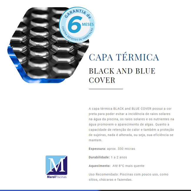 Desenvolvida nas cores Preta e Azul, a cor preta serve para poder evitar a incidência de raios solares na água da piscina, os raios solares e os nutrientes na água promovem o aparecimento de algas. Quanto a capacidade de retenção de calor e também a proteção de sujeiras, nada é alterada, ou seja, sua eficiência se mantem.