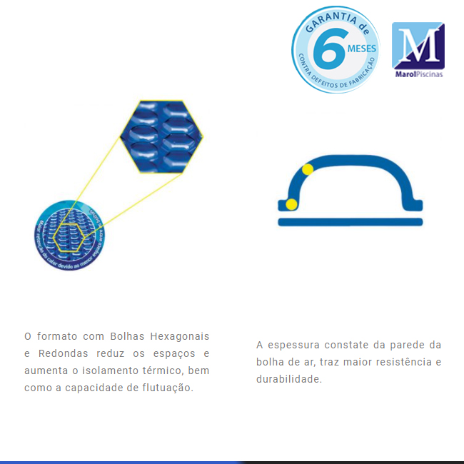 Disponível nas versões de 300 micras, 330 micras e 500 micras, as mantas térmicas contam com um sistema exclusivo de bolhas, aumentando a capacidade de flutuação e diminuindo a evaporação.
