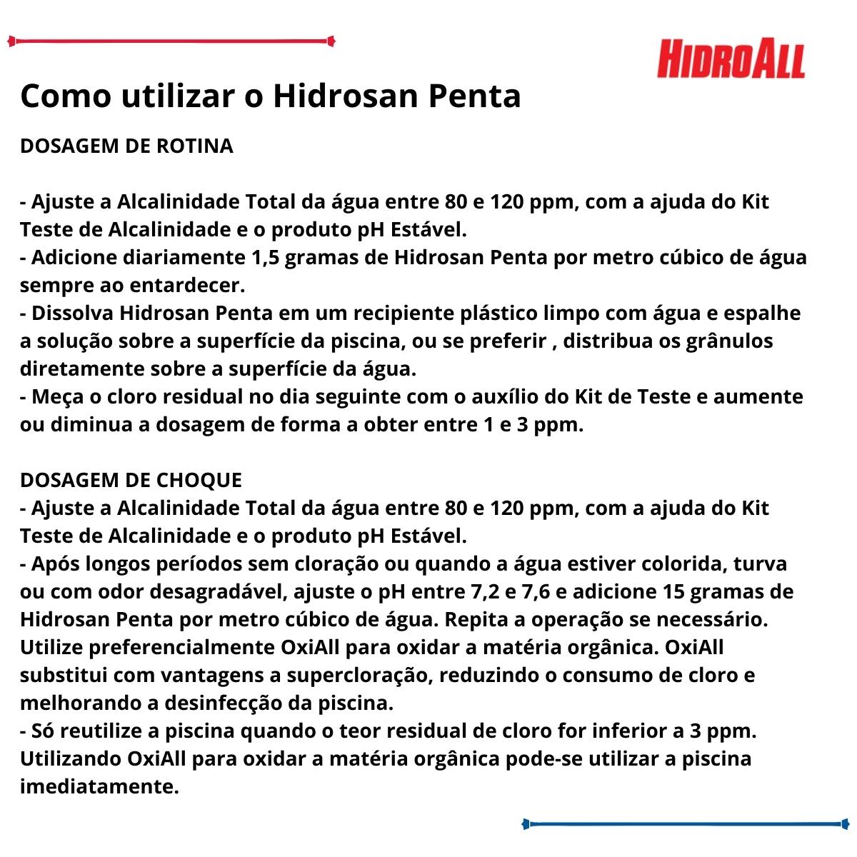 Após longos períodos sem cloração ou quando a água estiver colorida, turva ou com odor desagradável, ajuste o pH entre 7,2 e 7,6 e adicione 15 gramas de Hidrosan Penta por metro cúbico de água. Repita a operação se necessário. Utilize preferencialmente OxiAll para oxidar a matéria orgânica. OxiAll substitui com vantagens a supercloração, reduzindo o consumo de cloro e melhorando a desinfecção da piscina.
