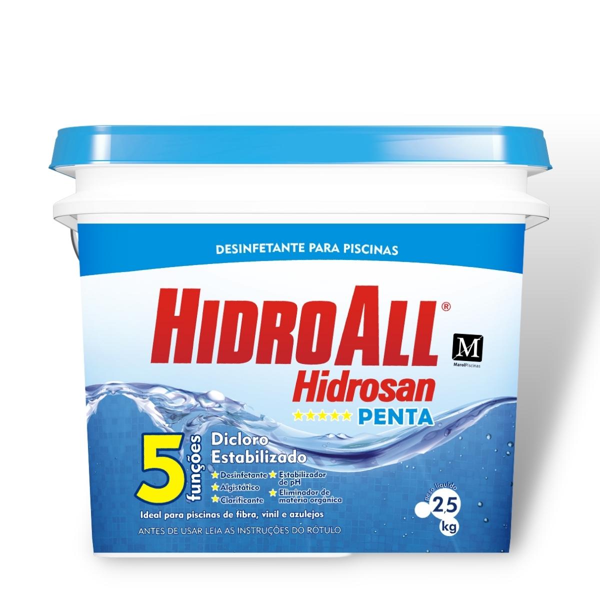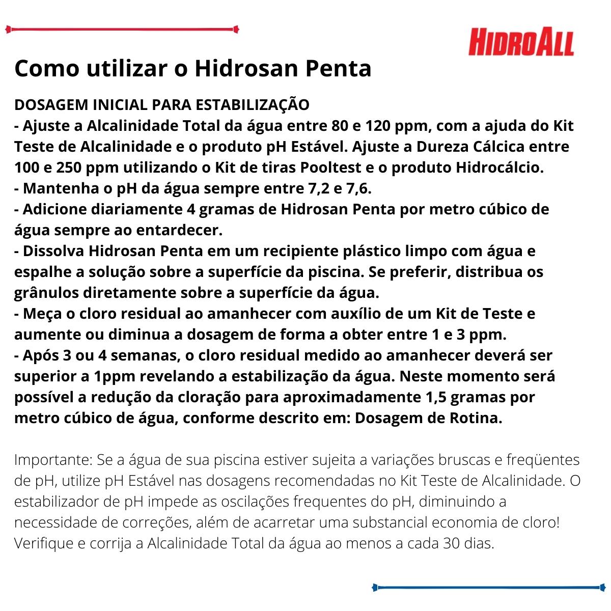 Devido a sua alta solubidade e pH neutro, Hidrosan Penta é indicado para tratar qualquer tipo de piscina. Hidrosan Penta contém estabilizador de cloro que impede a decomposição do cloro residual da água pelo sol. A estabilização do cloro ocorre após 3 ou 4 semanas, quando o estabilizador contido no Hidrosan Penta atinge a concentração de 25 a 30 ppm na água da piscina. Ao atingir esta concentração de estabilizador de água, o consumo de cloro se reduzirá à metade da dosagem inicial, ou menos, dependendo de fatores como: frequência, grau de contaminação, temperatura da água, etc. O uso de Hidrosan Penta mantém o teor residual de cloro estabilizado entre 1 e 3 ppm durante todo o dia, protegendo a água de sua piscina, o que não ocorre com produtos sem estabilizantes. Hidrosan Penta proporciona mais economia.