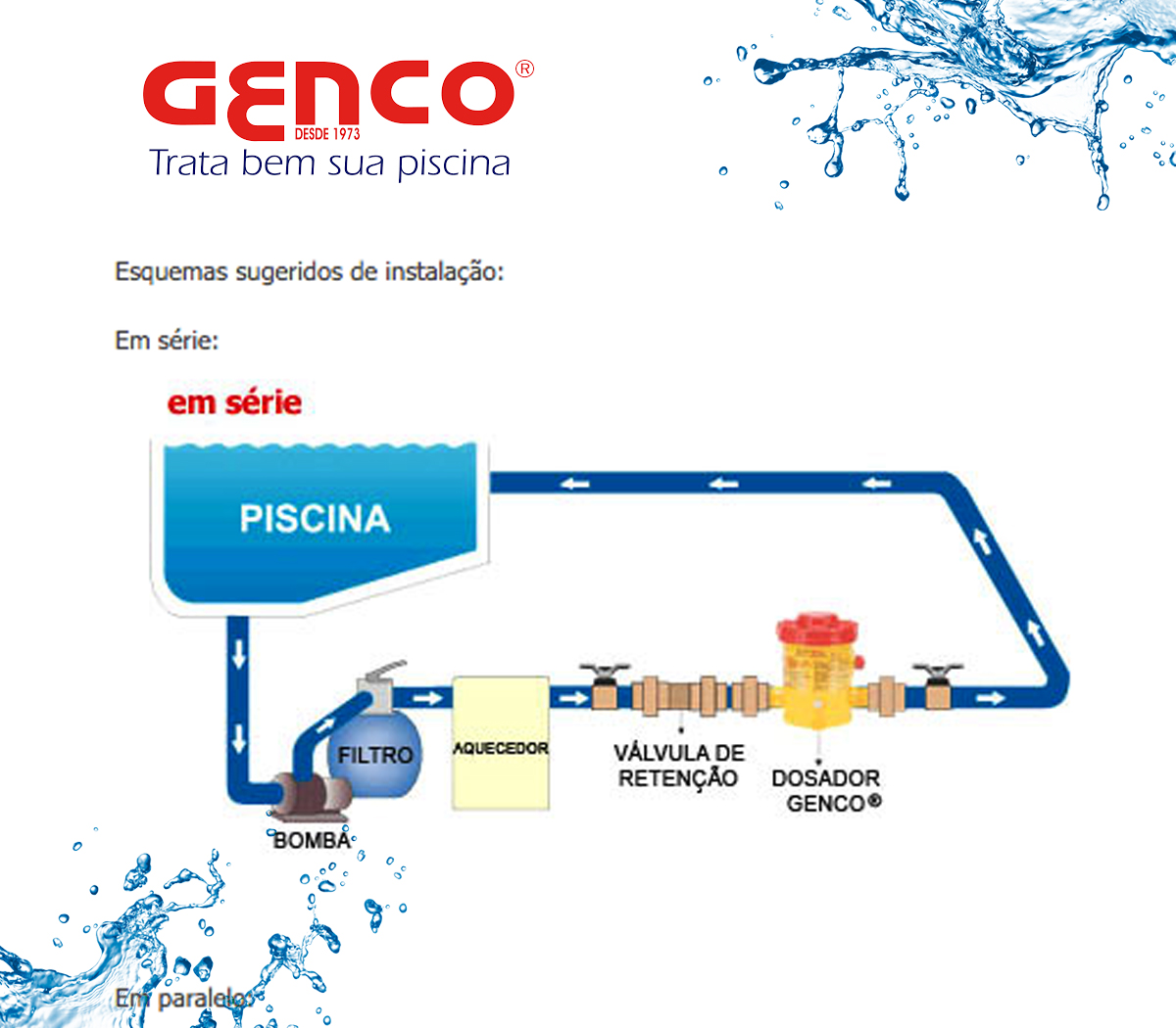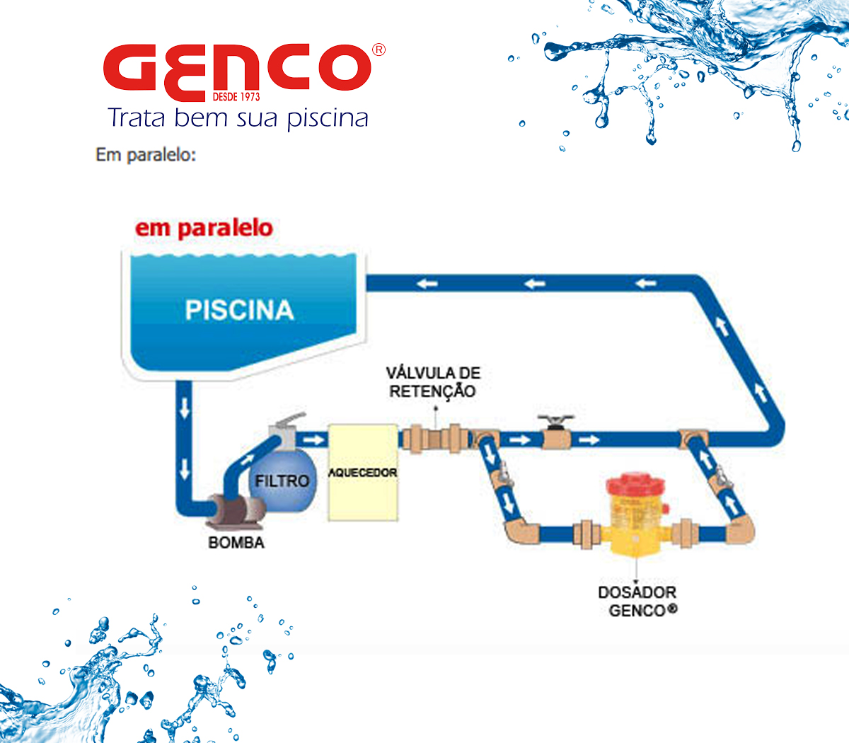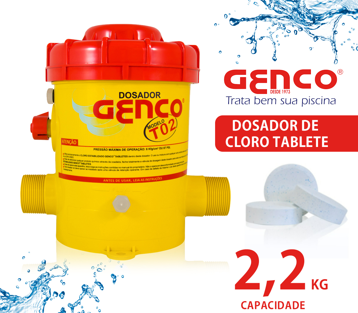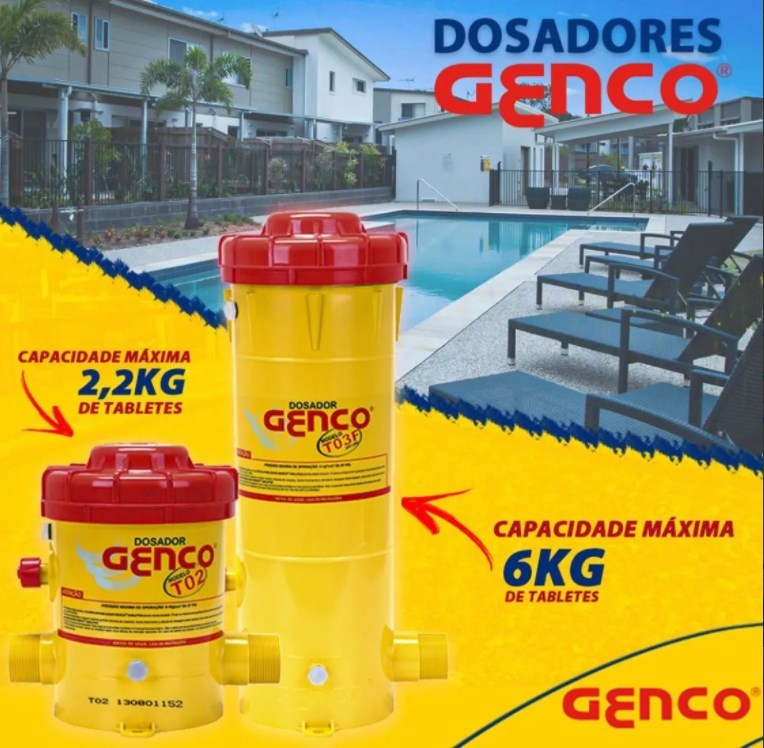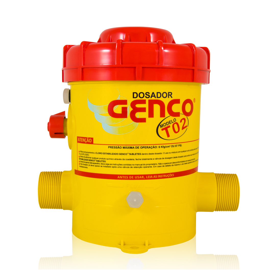 O Dosador Genco modelo T 02 tem disposição para 2,2 kg de Cloro Estabilizado GENCLOR Tabletes (de 20 ou 200 gramas). Os tabletes são alocados dentro do dosador, o qual é acomodado na tubulação de retorno da piscina, após filtro e aquecedor (se houver). A água, depois de filtrada, passa pela camada inferior dos tabletes contidos na câmara do dosador e dilui parte destes, voltando, clorada à piscina, onde dissolve seu teor de cloro com o restante da massa aquática. A repetição sucessiva desse processo, enquanto a motobomba estiver ligada, mantém o residual de cloro da água nonível esperado pelo usuário.