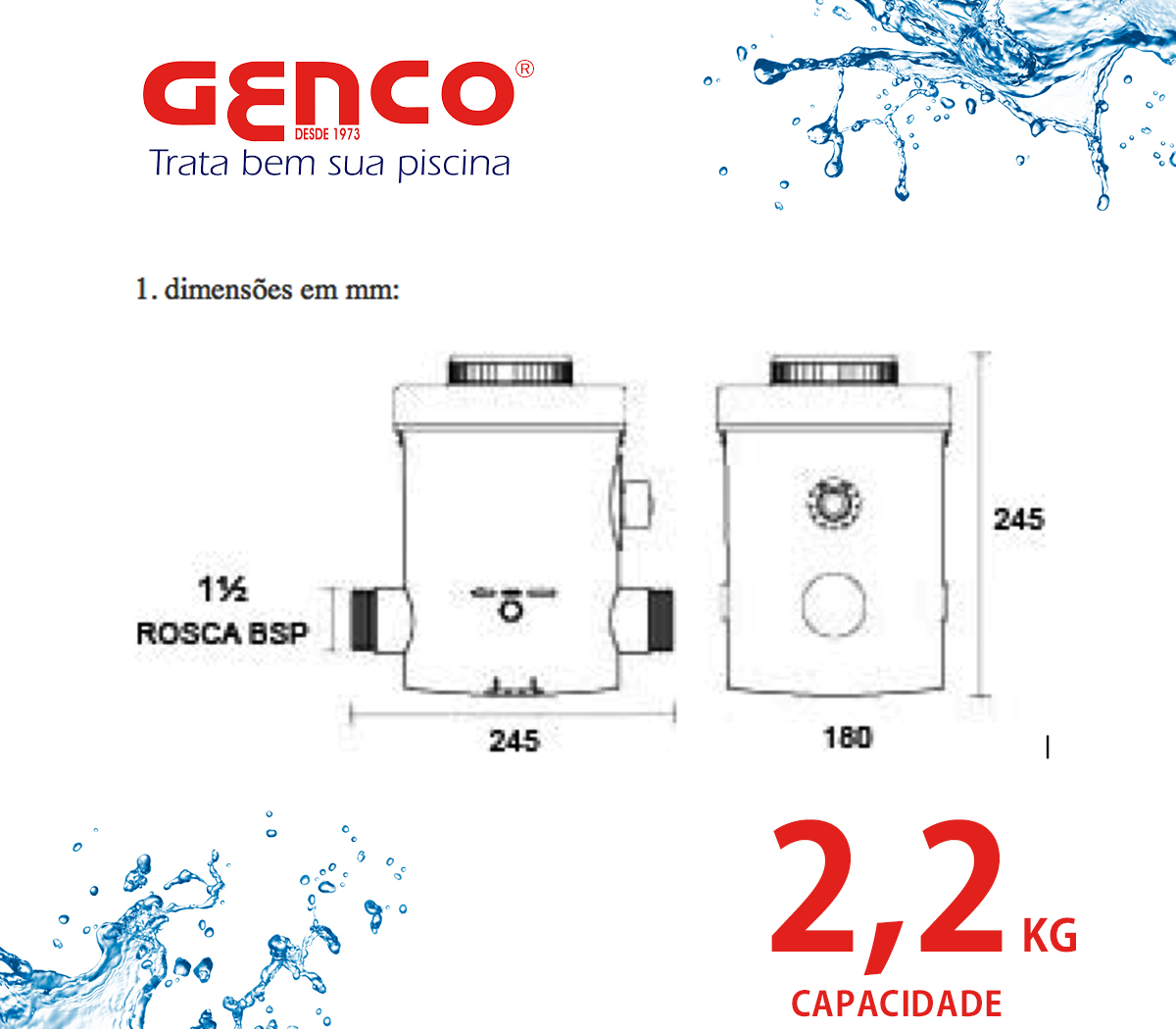 5. capacidade de carga: 2,2 Kg de Tabletes, T-20 ou T-200*2 Observações *1 Com motobomba de ½ CV, vazão média de 10.000 litros/hora, filtração em funcionamento por 6 horas diárias etc. *2 O Dosador Genco® Mod. T 02 foi desenvolvido exclusivamente para uso com Tabletes de Tri-cloro. O uso de qualquer outro produto dentro deste dosador pode ser perigoso e causa de acidentes graves.