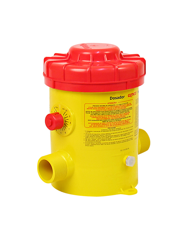 O dosador apresenta design em monobloco, compacto, e forte. É muito fácil de atuar – basta remover manualmente suas tampas (uma externa e outra interna) e enchê-lo com GENCLOR Tabletes a determinados períodos, que podem ser dias, semanas ou meses, de acordo com o volume da piscina. Ele foi desenvolvido para permitir acomodação fácil e rápida, diretamente em tubulações plásticas de 1 1/2 polegadas, através de conexões plásticas com rosca, mesmo em casas de máquinas pequenas, tanto de piscinas residenciais como coletivas de até 160 m3.