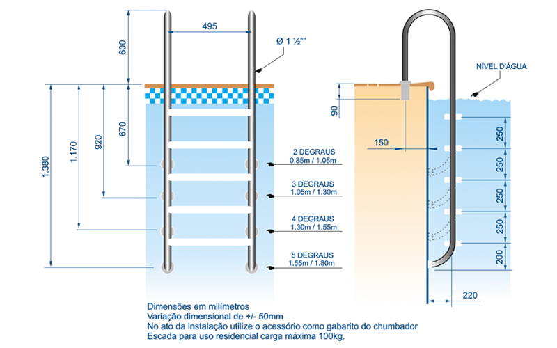 Escada para piscinas Marinheiro 1 1/2" - 2 Degraus Anatômicos em Inox - Sodramar