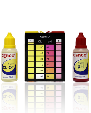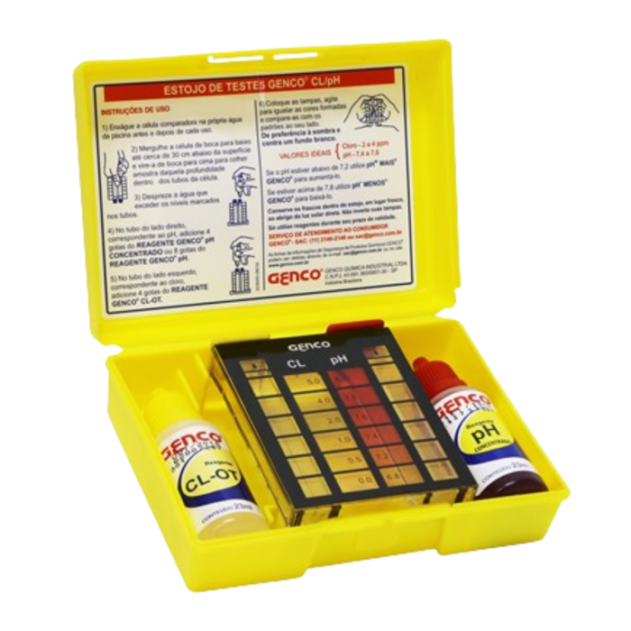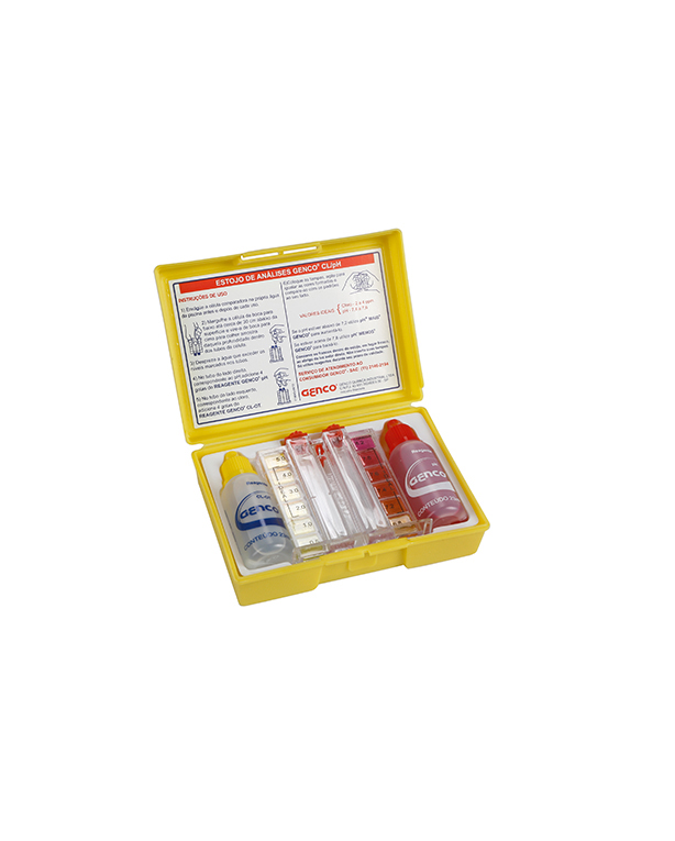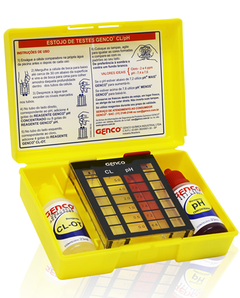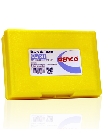 o Estojo de Análises GENCO® - Cl/pH estojo foi desenvolvido para análise do pH e Cloro livre na água da piscina.