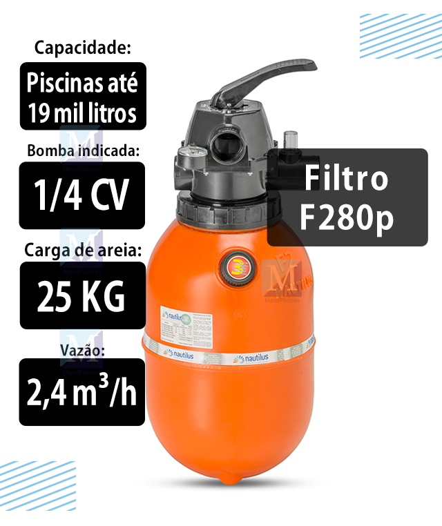 O filtro Nautilus para piscina F280P é indicado para piscinas de até 19m³.