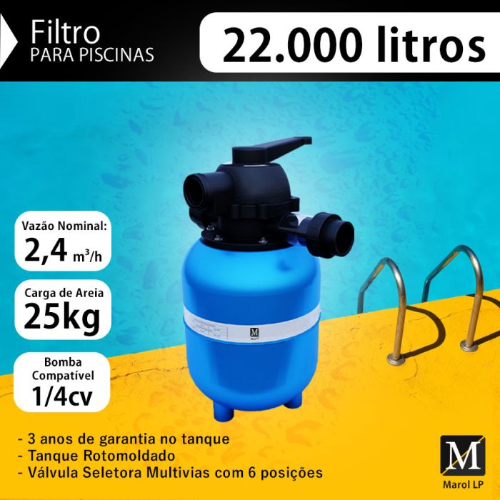 Os filtros da Marol lp 20 são de alta qualidade e desempenho, ideal para piscinas de uso residencial de até 22.000 litros, facilitando a sua limpeza com eficiência e economia, não oferecendo riscos à saúde. O tanque do filtro é produzido com polietileno rotomoldado, à prova de corrosão, em uma peça única, sem emendas, o que garante alta resistência ao produto.