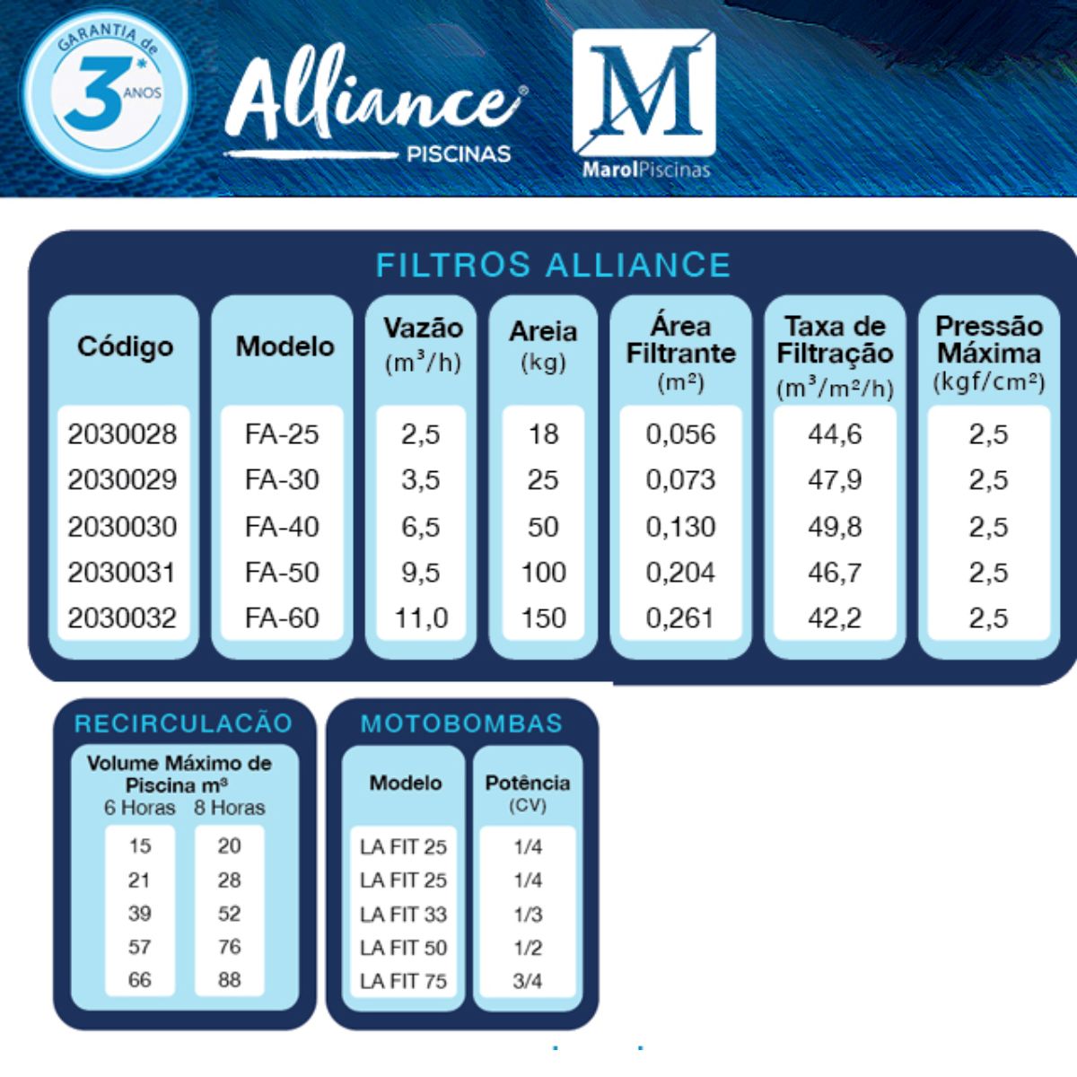 Filtro para piscinas até 52 mil litros FA-40 Alliance sinônimo de qualidade. Todos os produtos Alliance são fabricados com matérias-primas de melhor origem e usam alta tecnologia em sua fabricação.