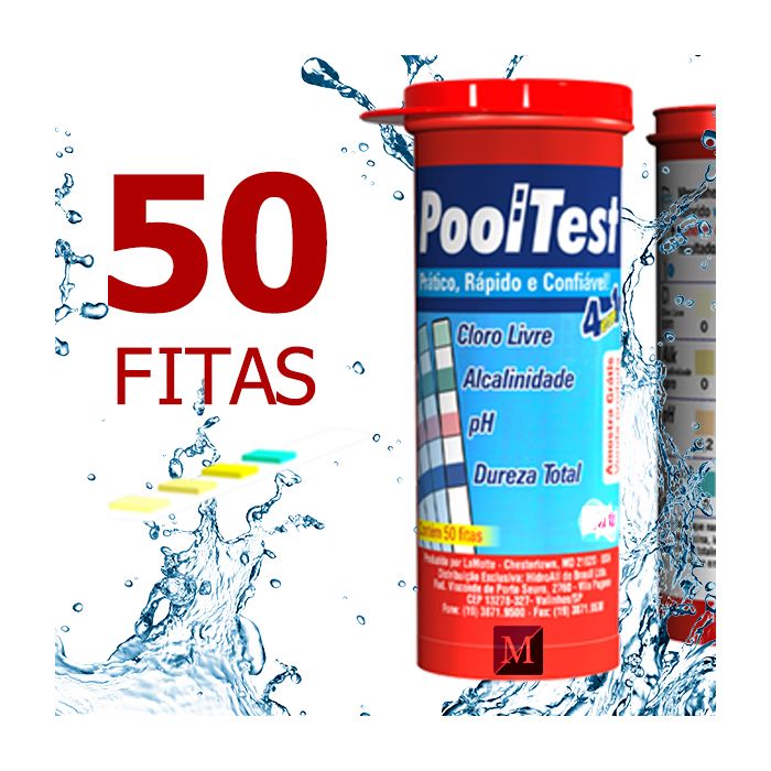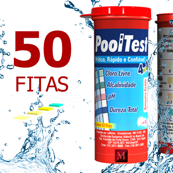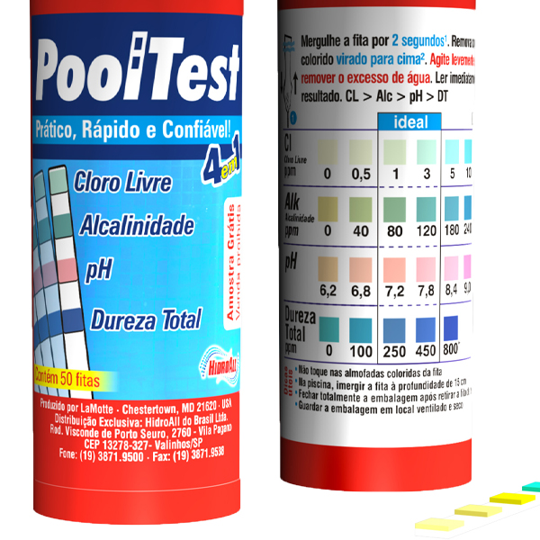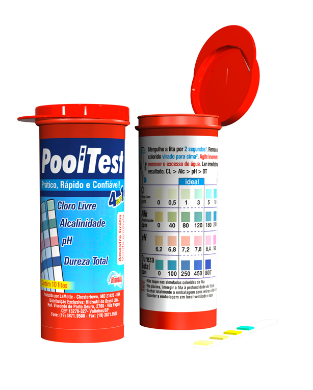 Pooltest é uma fita reagente de fácil uso, que averigua a condição da água da piscina instantaneamente e com precisão. Numa única medição, PoolTest 4 em 1 examina os níveis de cloro livre, alcalinidade, pH e dureza cálcica.