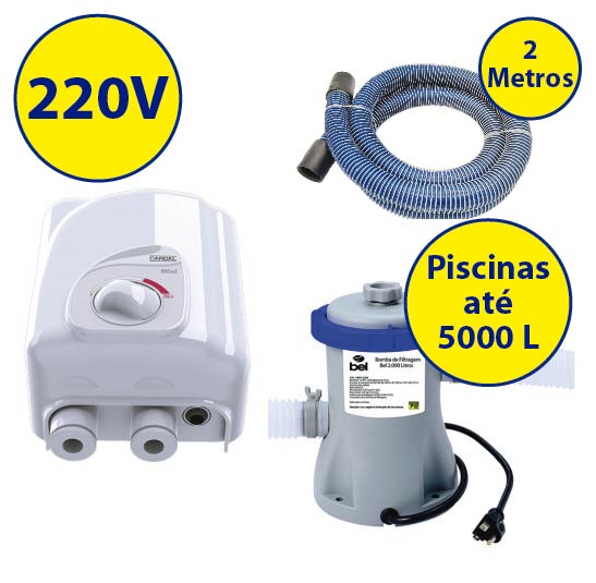 Kit completo para filtrar e aquecer piscinas de até 5000 litros.