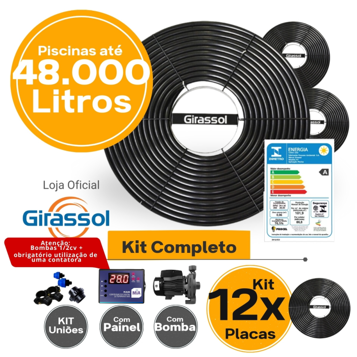 Kit Completo Aquecimento Solar para Piscinas até 48.000 Litros (12 PLACAS) Com CDT e Bomba 1,0 CV