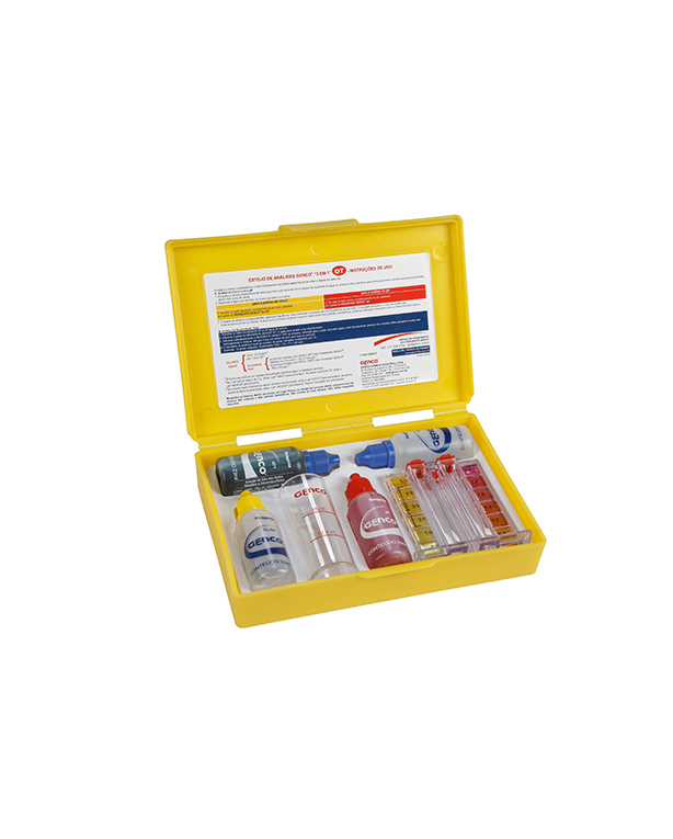 O ESTOJO DE TESTES GENCO® "3em1" - OT é instrumento imprescindível para o tratamento correto de águas de piscinas, pois é a partir dos resultados de suas análises que serão decididos os produtos a utilizar e suas respectivas dosagens. Ele permite analisar, de forma simples, fácil e econômica, os 3 parâmetros fundamentais da água da piscina: residual de Cloro Livre, pH e Alcalinidade Total. Kit Genco - Cloro Algicida Estojo de analise