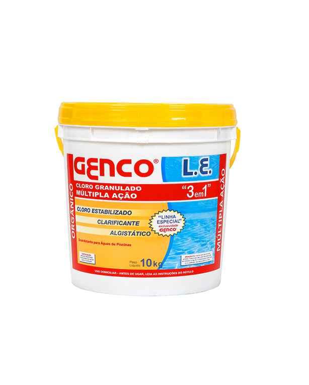 Cloro granulado Genco 3 em 1 - 10kg foi feito para você que gosta de praticidade e qualidade, alem de desinfetante, também possui propriedades auxiliares de clarificante e algistático.