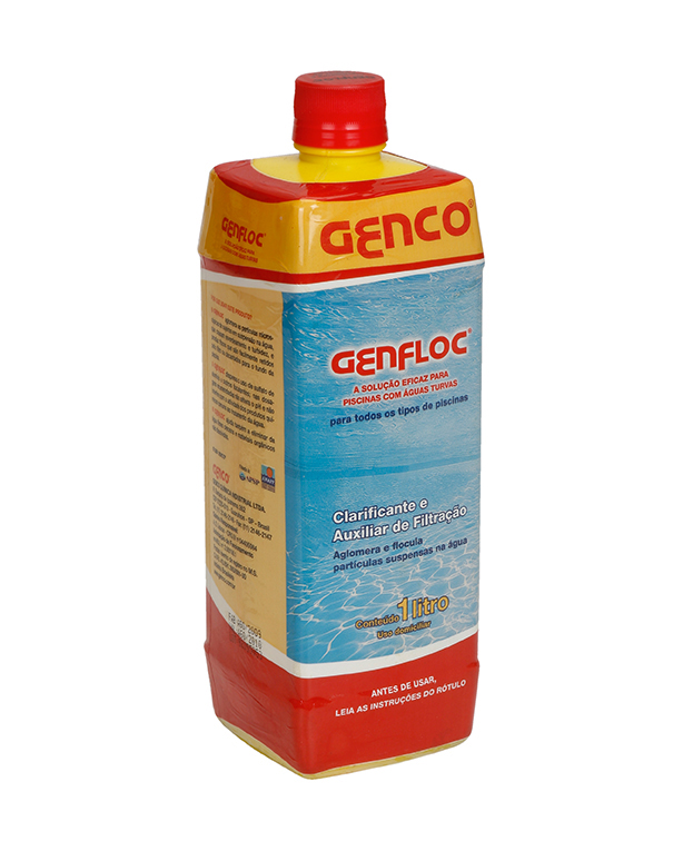GENFLOC Clarificante e Auxiliar de Filtração GENCO é um eficiente clarificante a auxiliar de filtração para águas de piscinas. Sua ação floculante atrai eletrostaticamente as partículas de sujeira que normalmente passariam pelo meio filtrante e forma com elas flóculos grandes que o filtro passa a reter. Isso aumenta o rendimento do filtro. Os flocos maiores e mais pesados decantam para o fundo da piscina de onde podem ser aspirados normalmente. O resultado é a clarificação completa da água.