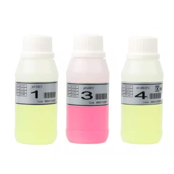 O kit com 3 padrões de calibragem pH-Redox Seko é uma solução completa que inclui frascos de calibração para pH4 e pH7, além de um frasco de calibragem para sondas de potencial Redox de 465 mV.