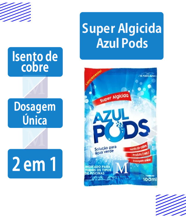 O Algicida Azulpods traz em um só produto os benefícios de eliminar e prevenir a formação de algas, pois também tem função algistática. Sua formula, livre de cobre não mancha a piscina e não agride os cabelos dos banhistas. Também é compatível com tratamentos clorados, garantindo uma piscina livre de algas e água sempre transparente.