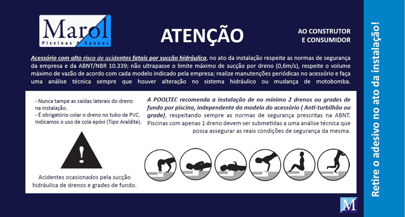 Toda instalação hidráulica em piscinas deverá seguir as normas que constam na ABNT prescritas na NBR 10.339. Seguir a norma, bem como, os tópicos de procedimentos citados acima é uma questão de segurança. A empresa não se responsabiliza por instalações que estejam em desconformidade com o que estiver prescrito na norma, que podem acarretar desde danos à equipamentos e acessórios, até acidente graves.
