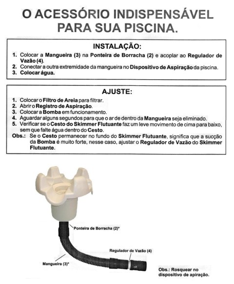 Função: O skimmer flutuante tem um chapéu que ajusta automaticamente ao nível da água para coar eficientemente, sempre o corpo do skimmer flutuante nivelado abaixo do nível máximo da água da piscina. Ao ajustar os cotovelos para a esquerda ou direita, o skimmer flutuante pode ser direcionado para induzir o fluxo da água, eliminando assim, pontos mortos aonde possam acumular os objetos.