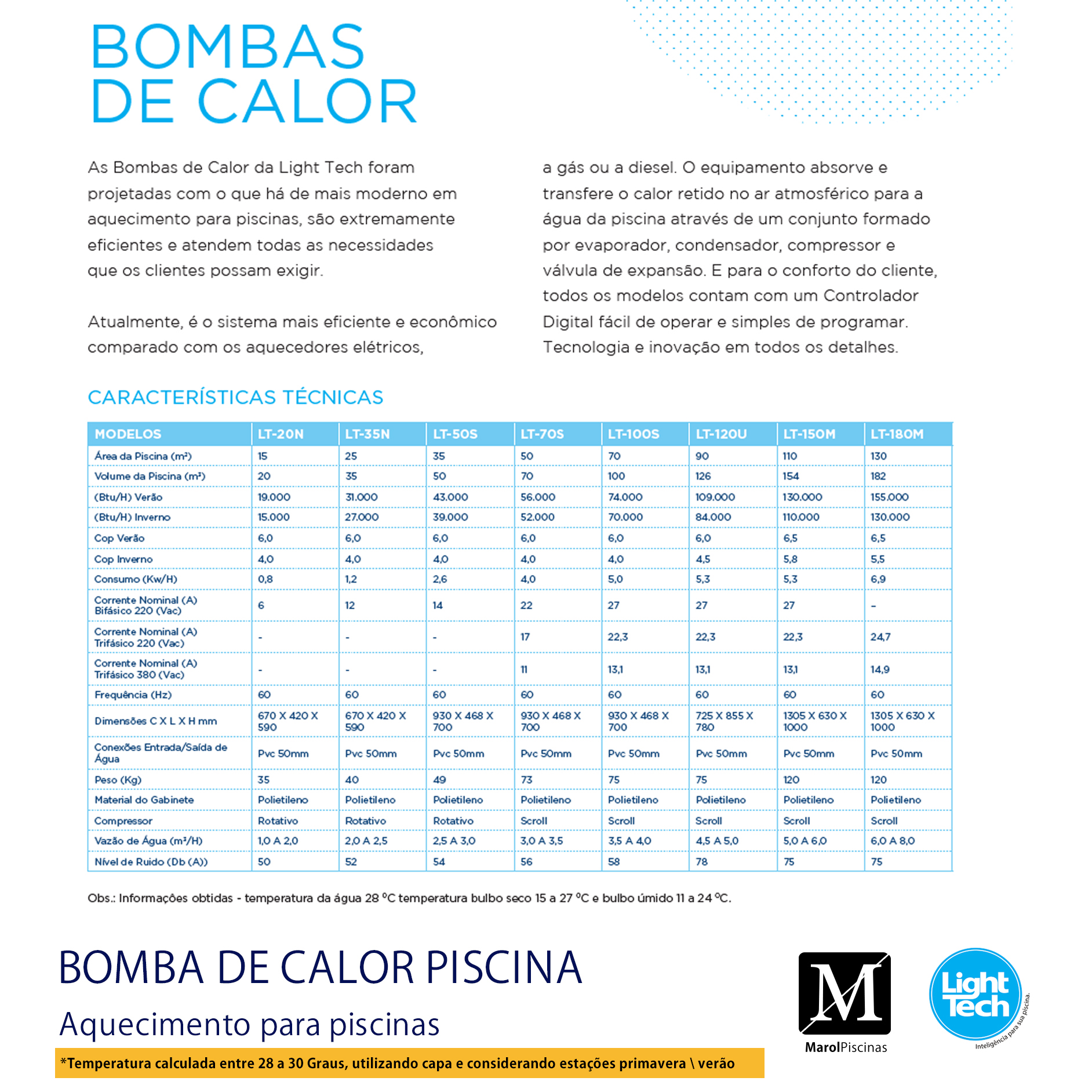 Chegou a mais avançada tecnologia em aquecimento de piscinas: BombaS de Calor Light Tech. RevolucionáriaS por dentro e por fora, a BombaS de Calor Para Piscinas Light Tech introduzem um novo conceito de design, segurança, resistência e economia.