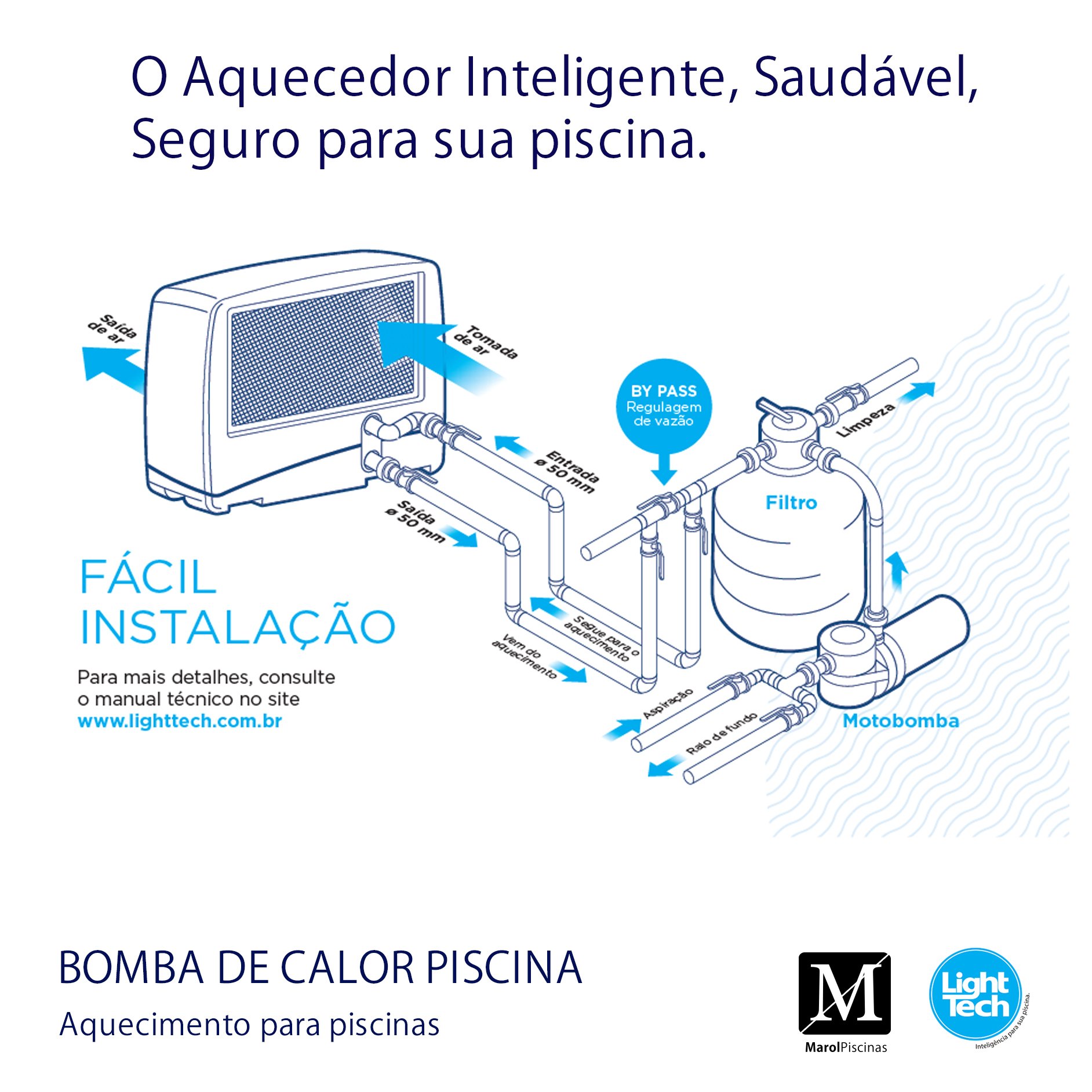 Os equipamentos absorvem e transferem o calor retido no ar atmosférico para a água da piscina através de um conjunto formado por evaporador, condensador, compressor scroll e válvula de expansão. Como retira o calor do ar, os Trocadores de Calor - Light Tech é hoje o sistema mais eficiente e econômico de aquecimento quando comparado com outros, tais como aquecedores a gás, elétricos, diesel, etc.