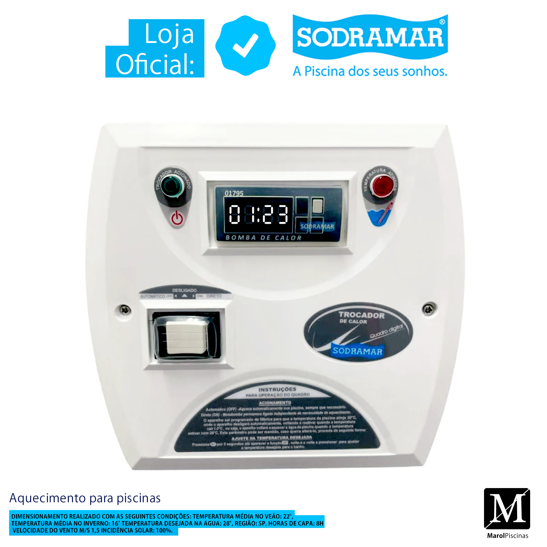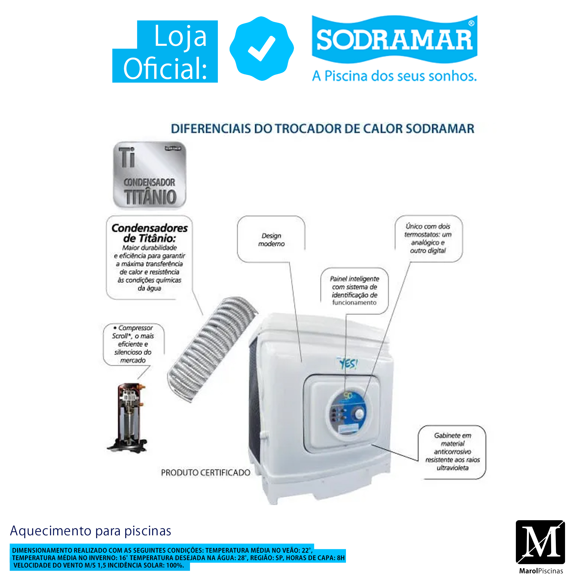 Reduz em até 80% de energia sobre os aquecedores com resistência elétrica, 75% sobre gás propano, 55% sobre gás natural. Os Trocadores de Calor - Sodramar - Linha Yes já saem de fábrica com o condensador titânio, isso garante maior durabilidade ao produto. O condensador titânio resiste sem problema a qualquer tratamento químico da água da piscina. A Sodramar tem como principais valores:
