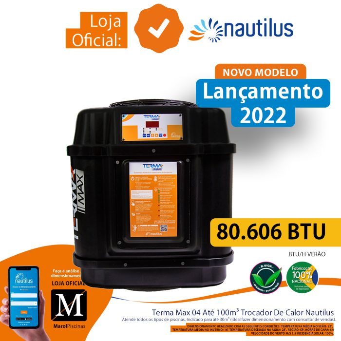 O Terma Max Trocador de Calor Nautilus é aconselhado para piscinas residenciais ou comerciais, é programada com uma temperatura específica, quando a água atinge a temperatura desejada, a bomba d'água desliga, sendo acionada automaticamente se a temperatura cair, esse processo é possível com o timer cíclico, que monitora a temperatura da água a cada hora.
